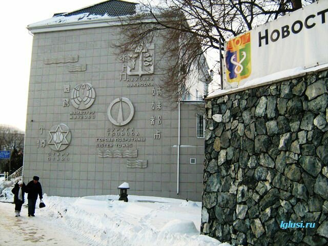 Стена с названиями городов-побратимов, это первые города, сейчас их больше, летом здесь небольшой фонтанчик, сейчас он засыпан снегом