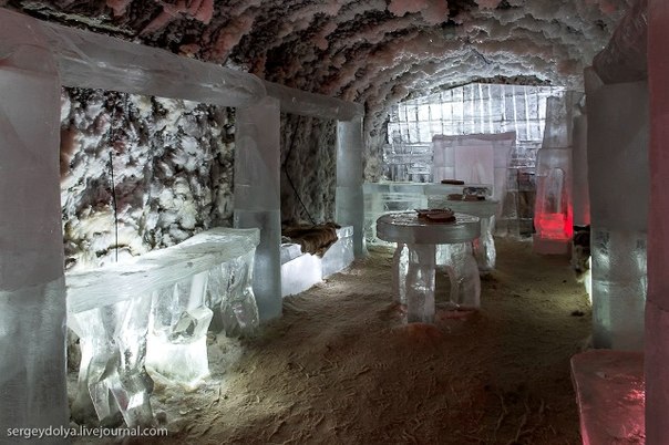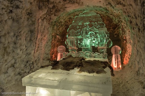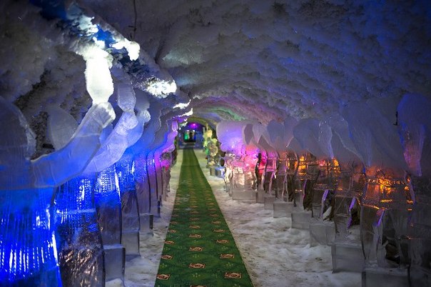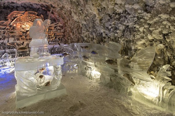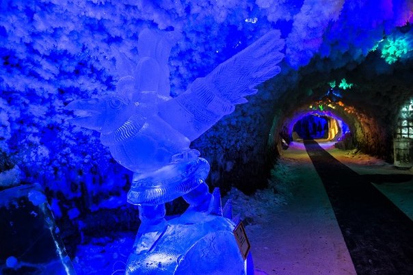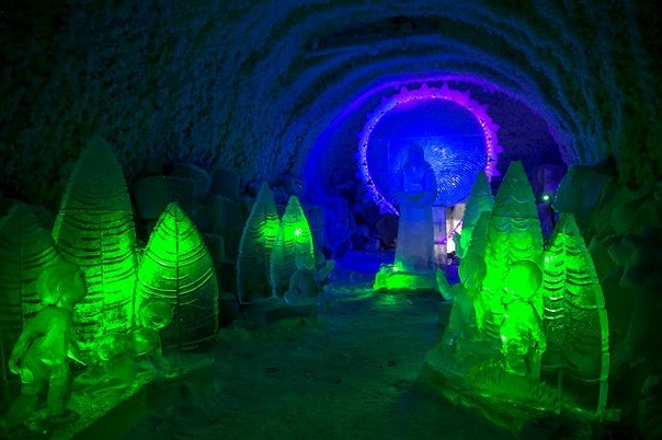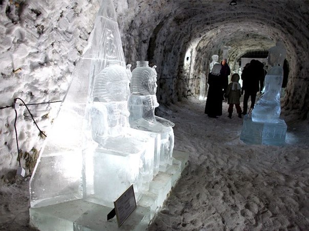 Лабиринты подземелья тянутся на несколько сот метров и повсюду стоят ледяные скульптуры, залы и переходы имеют свою тематику.