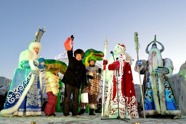 Встречают гостей якутский Хранитель Холода Чысхаан, Бык Зимы в человеческом обличии и сама Матушка Зима.