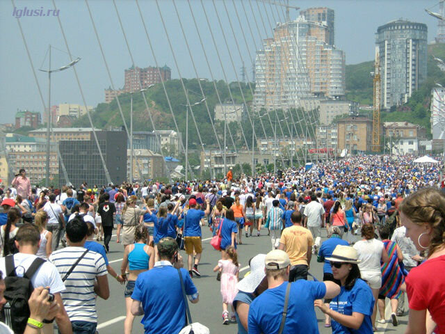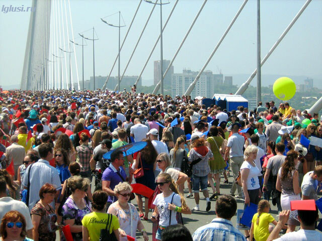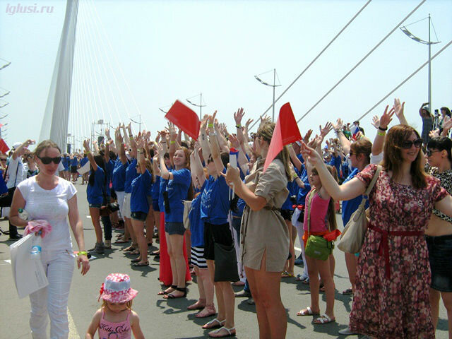 Недельное празднование 153 годовщины со дня основания Владивостока завершилось грандиозным флэшмобом на мосту и новым рекордом Гиннеса 7.07.2013 года.