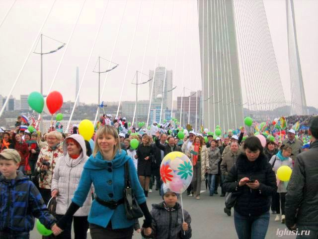 В этом году у Первомайской демонстрации Владивостока был новый маршрут, праздничное шествие прошло через Золотой мост и погода не подвела, было хмуро и прохладно, но дождик подождал пока закончится праздник.