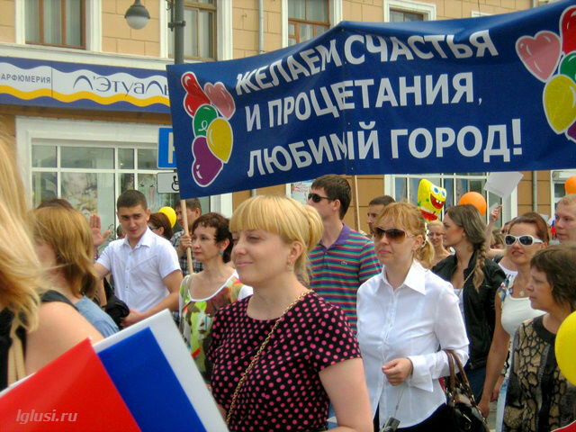 Колонны празднично одетых людей прошли по центральной улице с поздравлениями любимому городу.