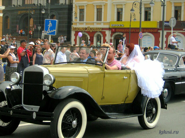 Молодожёны в свой торжественный день тоже присоединились ко всеобщему веселью и кто пешком, кто на ретро автомобилях, влились в праздничную колонну