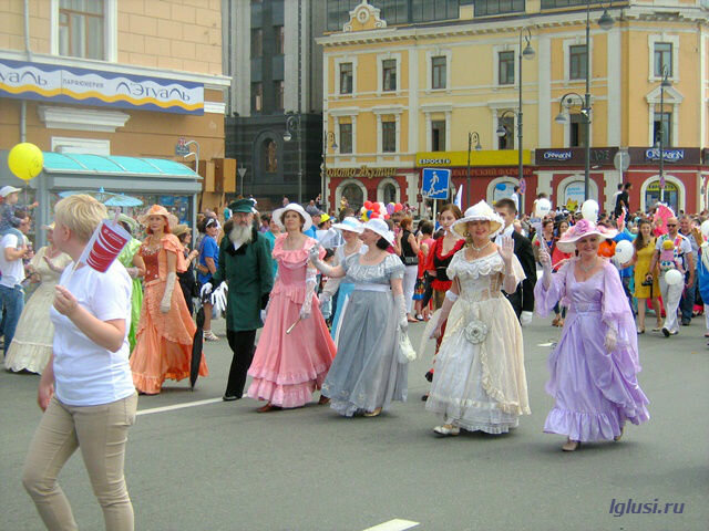 Мне идея с дореволюционными костюмами особенно понравилась — класс! Думаю, многие в душе хотели бы примерить платье тех лет со шляпками, а тут еще и по улицам в них пройтись можно… ПС. А колонна из Светлан большая получилась? Тоже прикольная идея, молодцы ваши авторы, креативные ))
