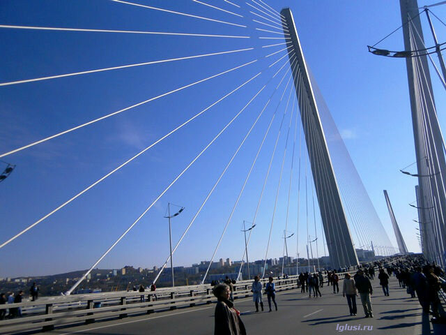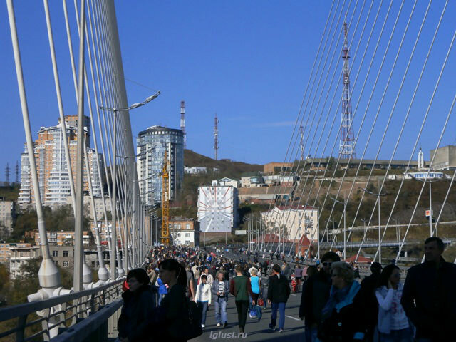 Ещё одна традиция Владивостока открывать Золотой мост для пешеходов на праздники, тех кому приходится в это время ездить в объезд, наверное не очень радует такая традиция, но прогулки по мосту доставляют огромное удовольствие