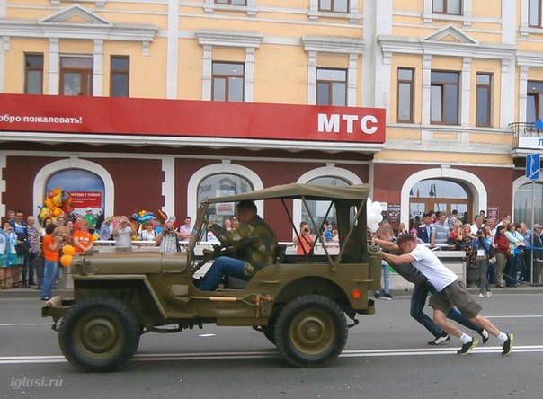 Дружно подтолкнули ретро-автомобиль из музея авто-мотостарины, похоже он специально заглох, как в старые добрые времена