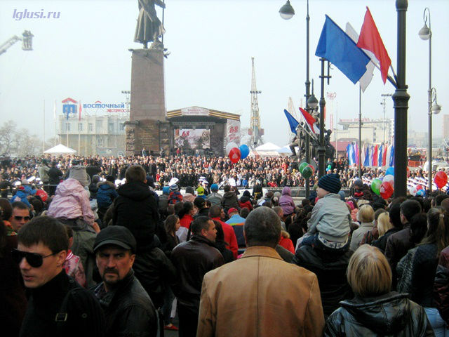 Праздник Памяти, праздник Воинской Славы нашей страны, один из самых значимых праздников России – День Победы начинался во Владивостоке с воинского парада, кроме наших доблестных воинов и курсантов по площади прошли роты французских и американских моряков, военная техника Тихоокеанского флота, колонна музея автомотостарины, Бессмертный полк – родственники несли портреты воинов павших за Родину, ветераны других войн и локальных конфликтов, патриотические клубы.